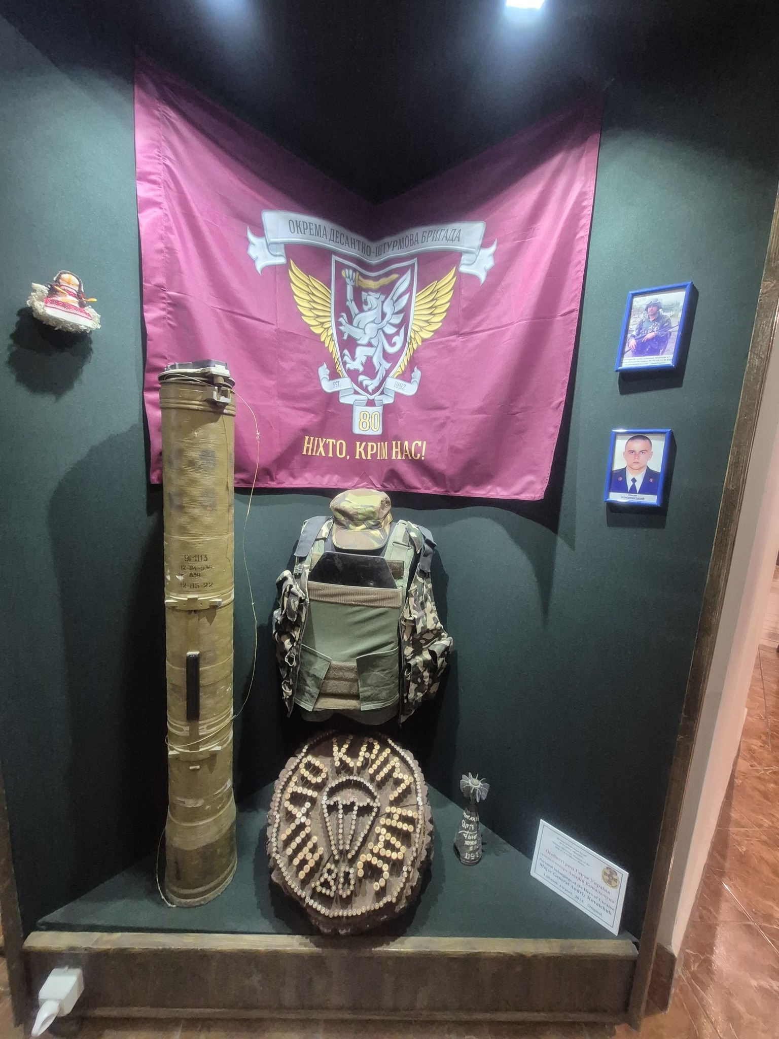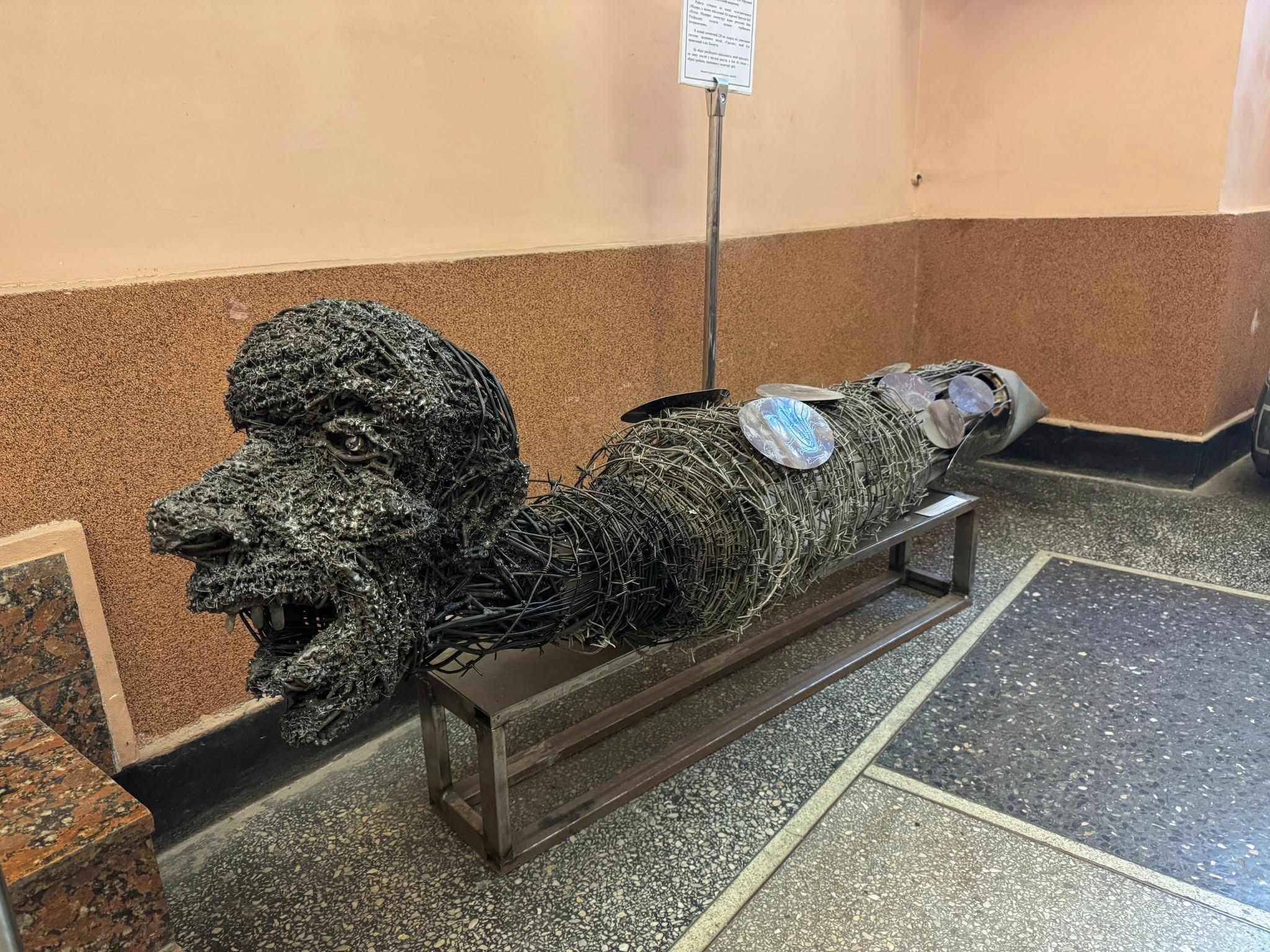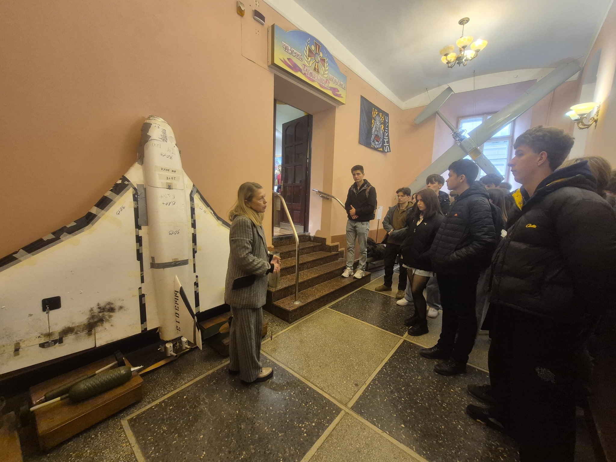 Студентів також вразив новий експонат на виставці — "Хробак Інтервент", створений івано-франківським митцем Петром Грицюком. В основі цієї експозиції — осколок від ракети системи "Ураган", привезений з-під Бахмута. Автор подає його як символ російського військового, який приходить на нашу землю у вигляді ракети, а завершує свій шлях під землею — у вигляді хробака. Така метафора передає ницість і руйнівну природу окупанта, протиставляючи її силі й стійкості українського народу.