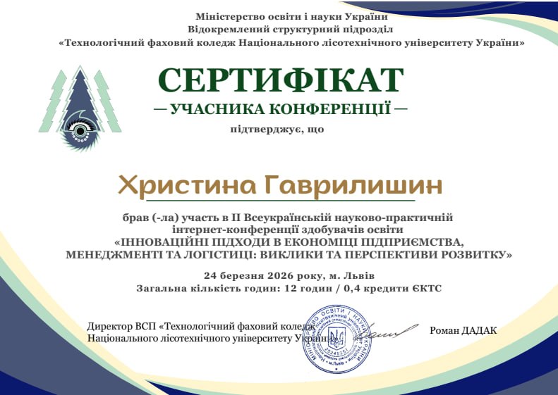 24 березня 2026 року у ВСП«Технологічний фаховий коледж Національного лісотехнічного університету України" відбулася ІІ Всеукраїнська науково-практична конференція «Інноваційні підходи в економіці підприємства, менеджменті та логістиці: виклики та перспективи розвитку».