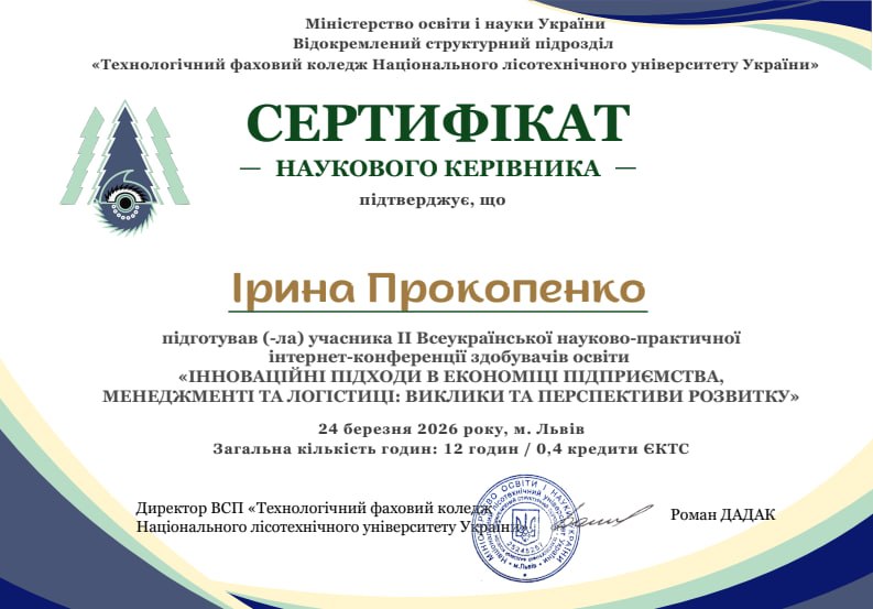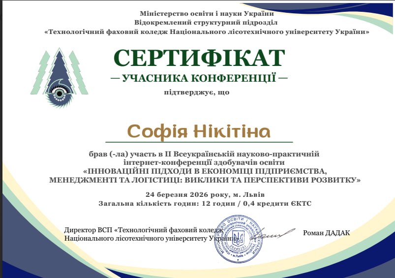 24 березня 2026 року у ВСП«Технологічний фаховий коледж Національного лісотехнічного університету України" відбулася ІІ Всеукраїнська науково-практична конференція «Інноваційні підходи в економіці підприємства, менеджменті та логістиці: виклики та перспективи розвитку».